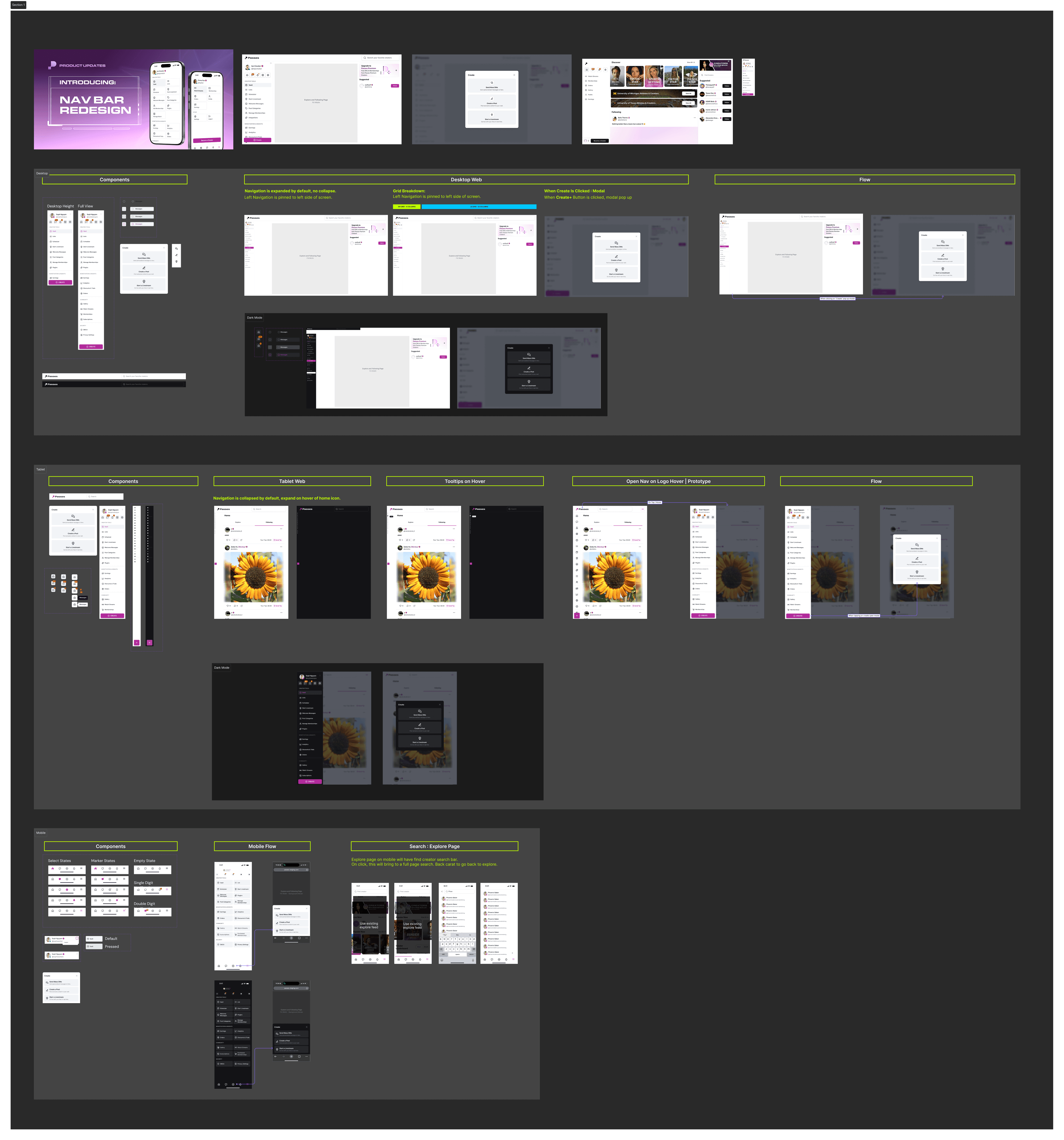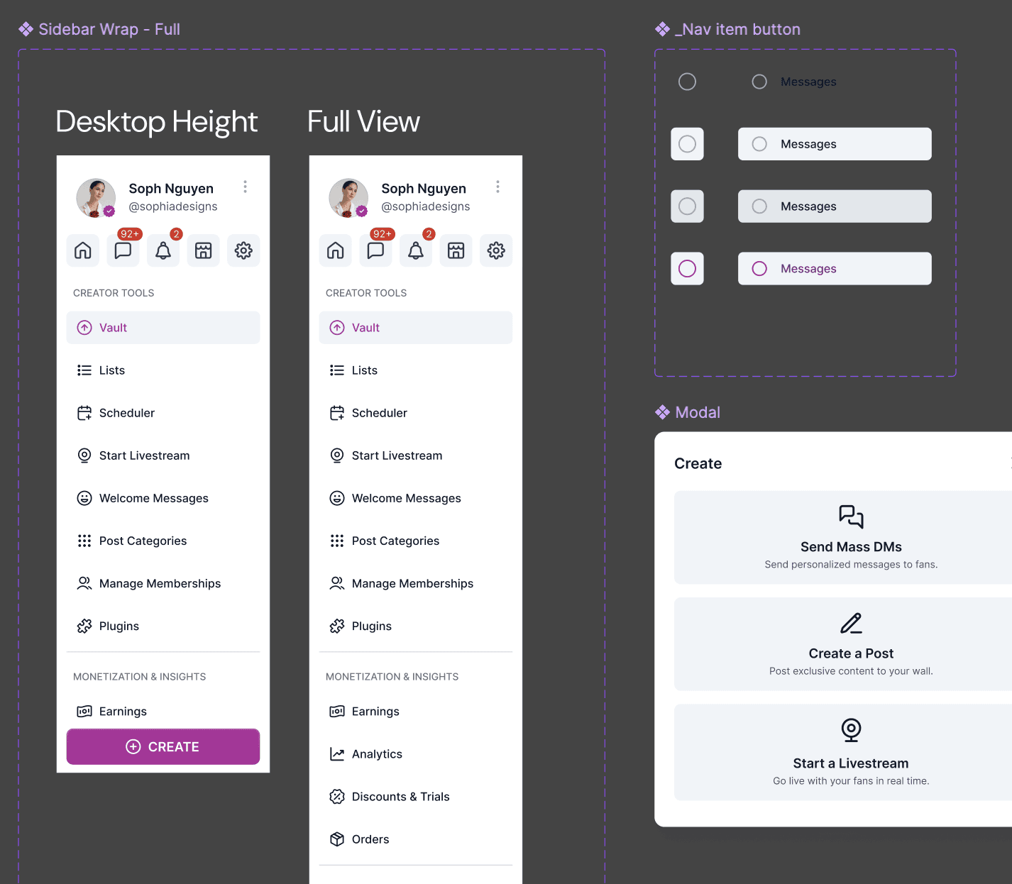 Redesigned global navigation across web and mobile for both creators and fans. On the creator side, I separated everything into four clear sections, added quick-action buttons, and introduced a new Create modal for posts, mass DMs, and livestreams. On mobile, we replaced the old four-tab bar with a smarter layout.