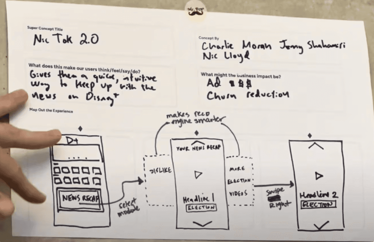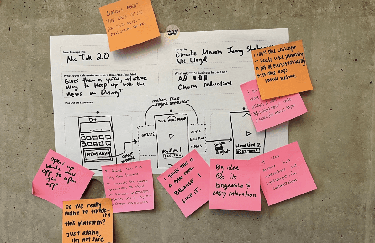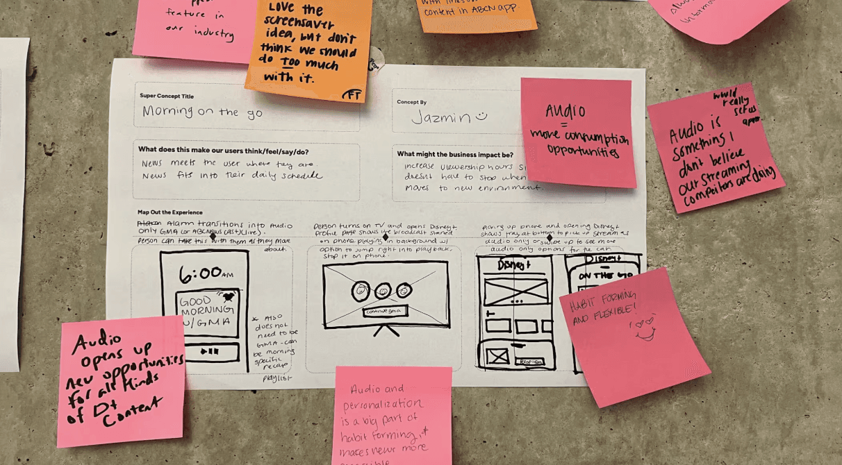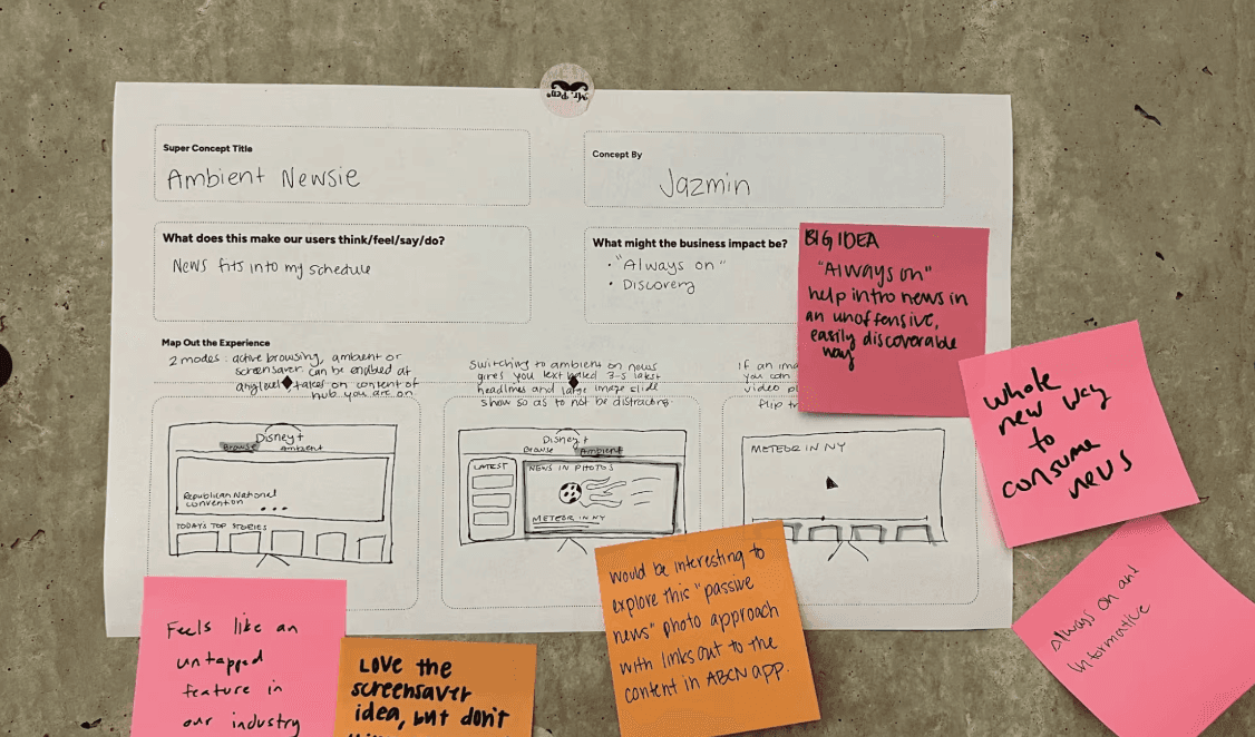 Next, we refined these ideas into what we called 3-Frame Superconcepts . This approach helped us think beyond one-off features and consider how they could scale and connect with other ideas. Cool themes that came out of Superconcept Explorations: Immersive Home: A dynamic home screen with live updates and personalized news highlights. Brand Row: Dedicated rows for ABC News content, maintaining brand trust. Mobile First Content : Introducing short form content from news reels and original content News Hub & Hub Page: Centralized news hub with intuitive navigation and deep dive options. Connection Points: Seamless links from Disney+ to ABC News for comprehensive coverage.