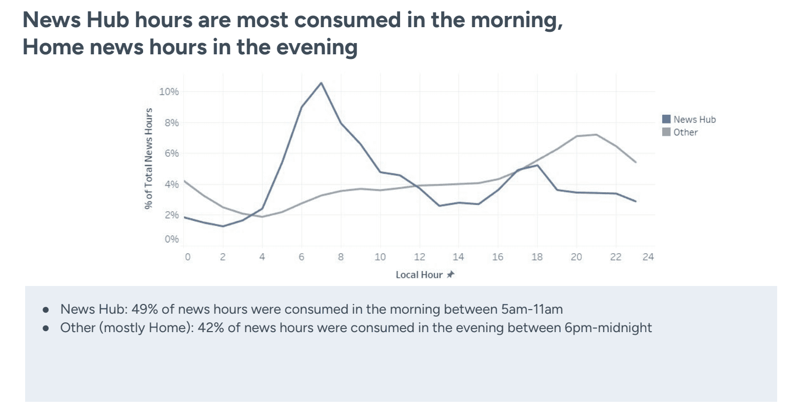 News Consumption: A significant portion (91%) of news hours comes from the Home screen.