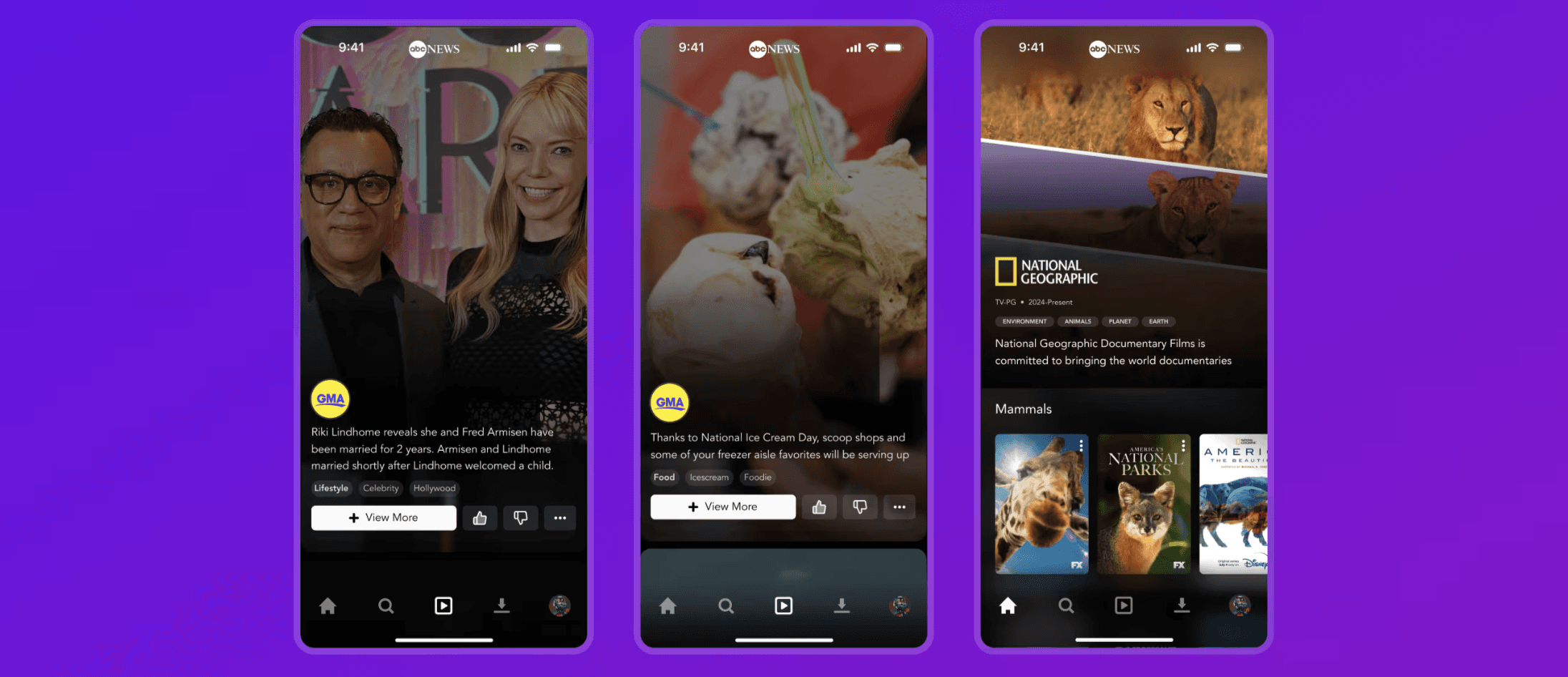Each video includes a profile picture for brand recognition: Brand Recognition: Profiles for brands like National Geographic, ABC News, and more. Easy Navigation: Allows users to navigate to Disney+ to watch related documentaries or episodes from Good Morning America (GMA) and specific news segments.